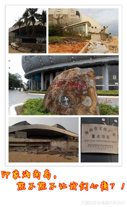 從2014年7月20日威馬遜臺(tái)風(fēng)洗劫后,《印象海南島》便停止演出了,場(chǎng)地?fù)p壞,演員解散,昔日的繁華輝煌不再,只留下了幾個(gè)工作人員看守破敗的場(chǎng)館。