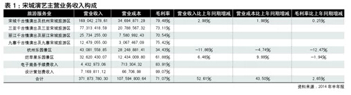 在一個(gè)公園+一臺(tái)演出的基礎(chǔ)上,宋城景區(qū)通過(guò)景區(qū)門票、演藝票及物業(yè)租賃取得收益。在門票方面,通過(guò)與旅行社合作吸引來(lái)杭州的游客觀賞,通過(guò)收取游客的門票費(fèi)用賺取利潤(rùn)。因此,票價(jià)的提升在某種程度上拉升了其營(yíng)業(yè)收入。2014半年報(bào)也顯示,在報(bào)告期內(nèi),宋城演藝共接待游客和觀眾543萬(wàn)人次,實(shí)現(xiàn)營(yíng)業(yè)收入3.91億元,同比上漲48.41%;營(yíng)業(yè)利潤(rùn)實(shí)現(xiàn)2.15億元,比去年同期增長(zhǎng)42.59%。宋城演藝的一位內(nèi)部人士也向記者透露,全國(guó)旅游市場(chǎng)下半年整體發(fā)展態(tài)勢(shì)肯定會(huì)比上半年好,另一個(gè)可以肯定的是宋城演藝今年同期肯定會(huì)比去年同期好。
